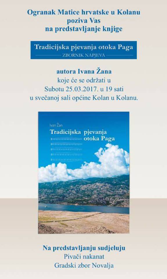 Ogranak Matice hrvatske u Kolanu poziva Vas na predstavljanje knjige "Tradicijska pijevanja otoka Paga" autora Ivana Žana, koje će se održati u subotu, 28. ožujka 2017 sati u 19:00 sati u prostoru Svečane sale Općine Kolan.