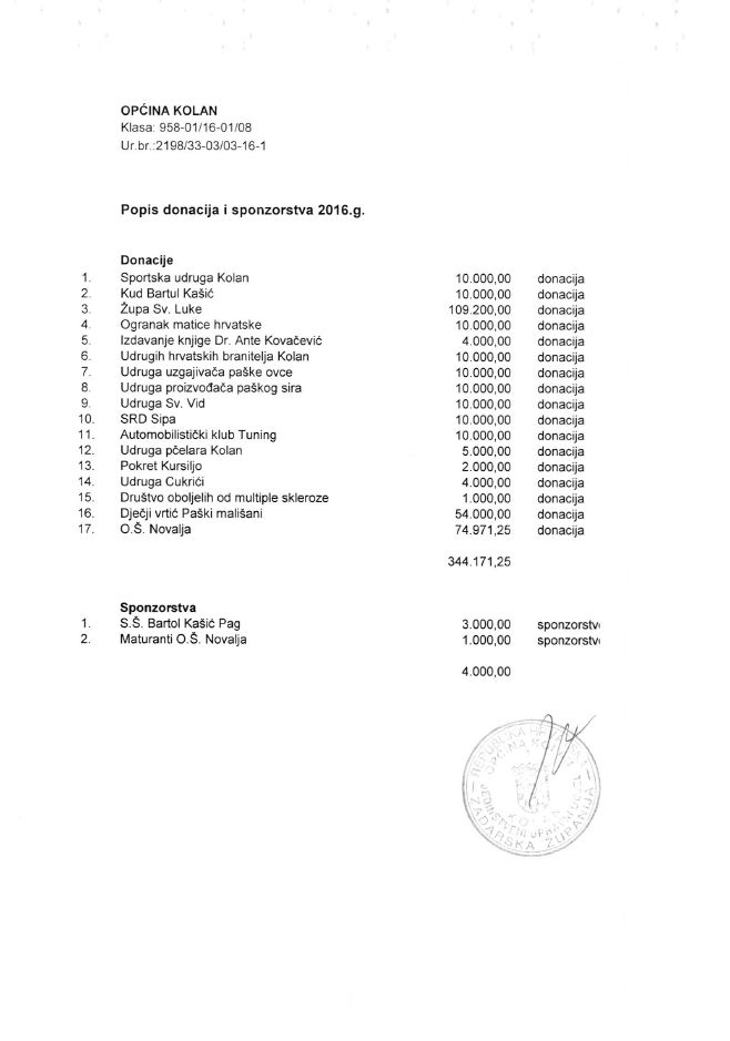 - Popis donacija, sponzorstva i sufinanciranja za 2017